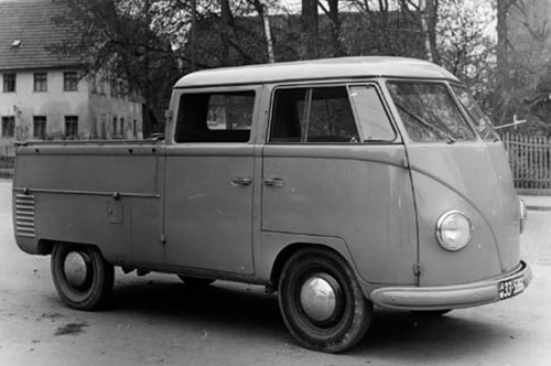 Le 25 août 1952, le premier véhicule plateau “Transporter VW ouvert” sort de l’usine de Wolfsburg. En plus de sa plate-forme de 2600x1570mm, le véhicule propose 1,90m3 de chargement dans une soute fermée à clef. Ce véhicule est alors le moins cher de la gamme.