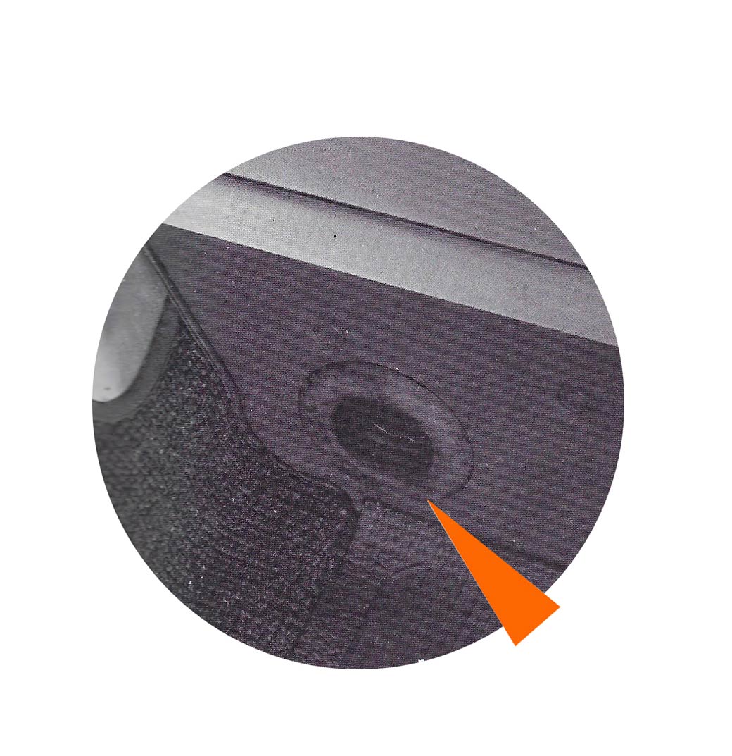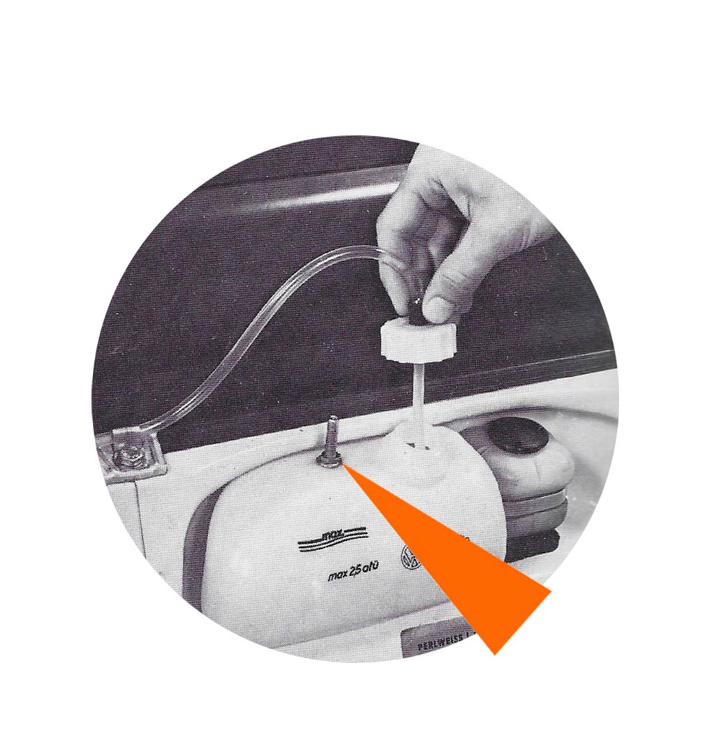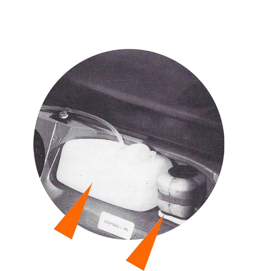 - Le bocal de lave-glace est fixé dans la roue de secours et sa mise sous pression de 1 bar est maintenue par la pression de la roue de secours au fur et à mesure de l’utilisation du liquide.