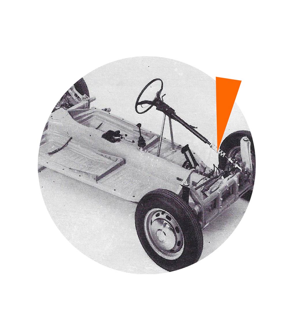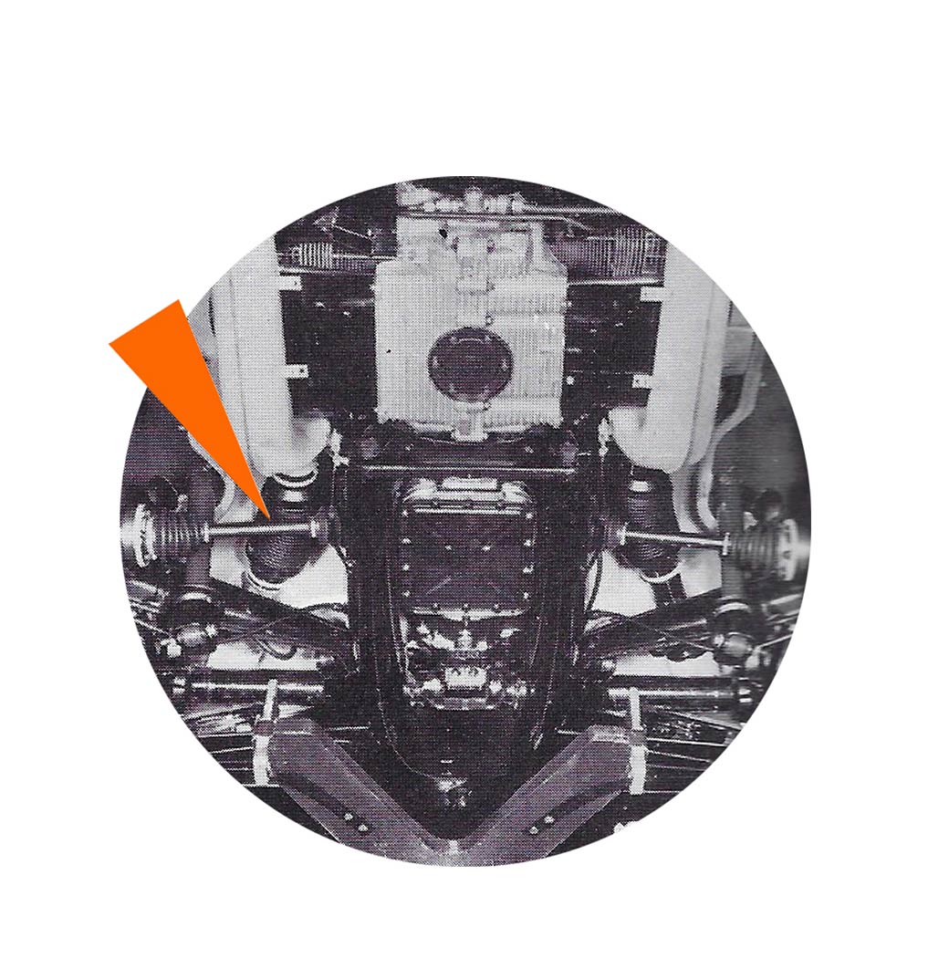 - Nouveau dessin train avant : abandon des pivots pour passer en rotules porteuses. Passage des barres de torsion en 10 lames au lieu de 8. Hauteur entre les tubes de train avant accrue, passant de 120 mm à 150 mm. Modification du nez de châssis en conséquence. Par ailleurs, les points d’ancrage des amortisseurs avant sont modifiés et les amortisseurs avant en conséquence.