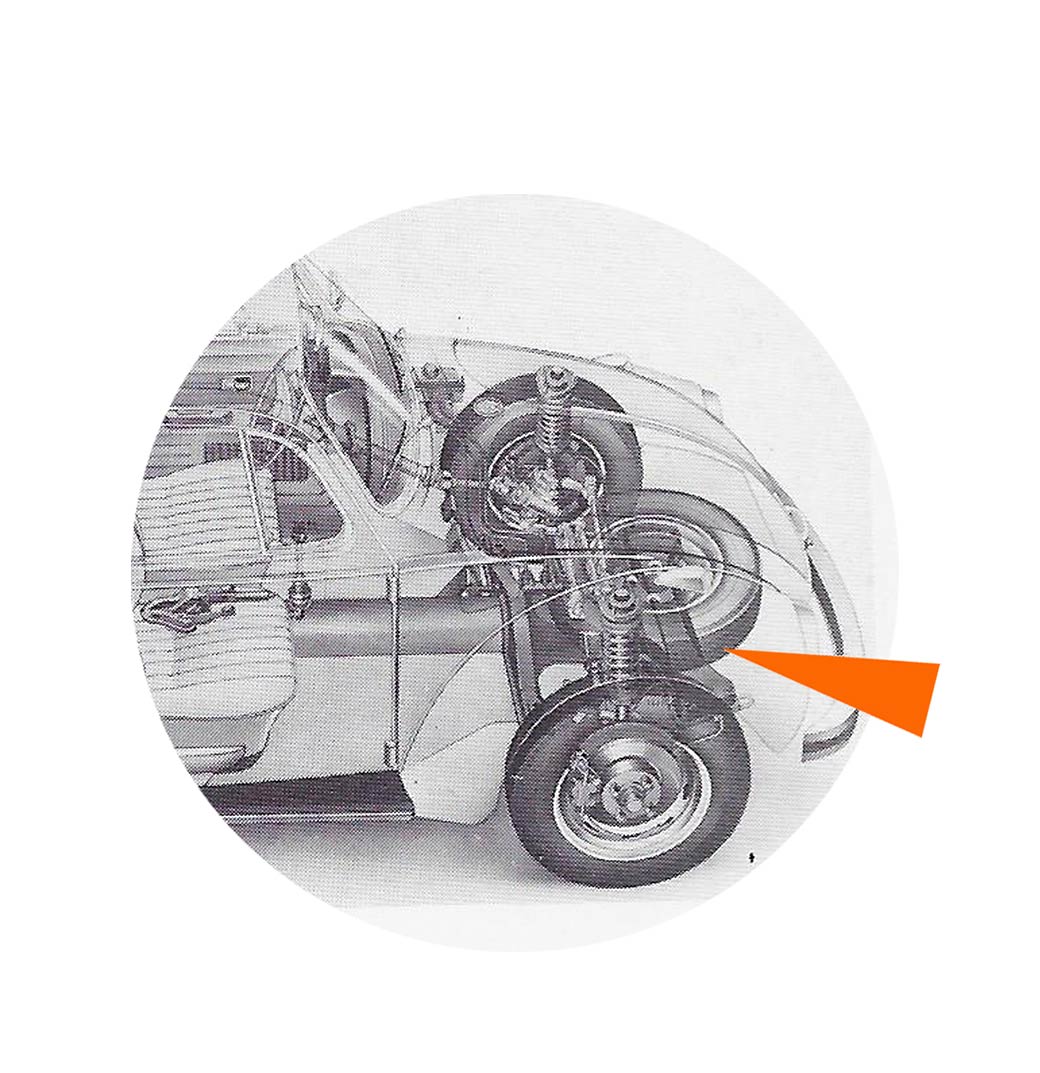 - Le train arrière à cardan permet la mise en place d’un bras oscillant renforçant la tenue de route. La hauteur de caisse reste déterminée par les crans de la lame au niveau de la barre de torsion arrière qui reste le système de suspension.